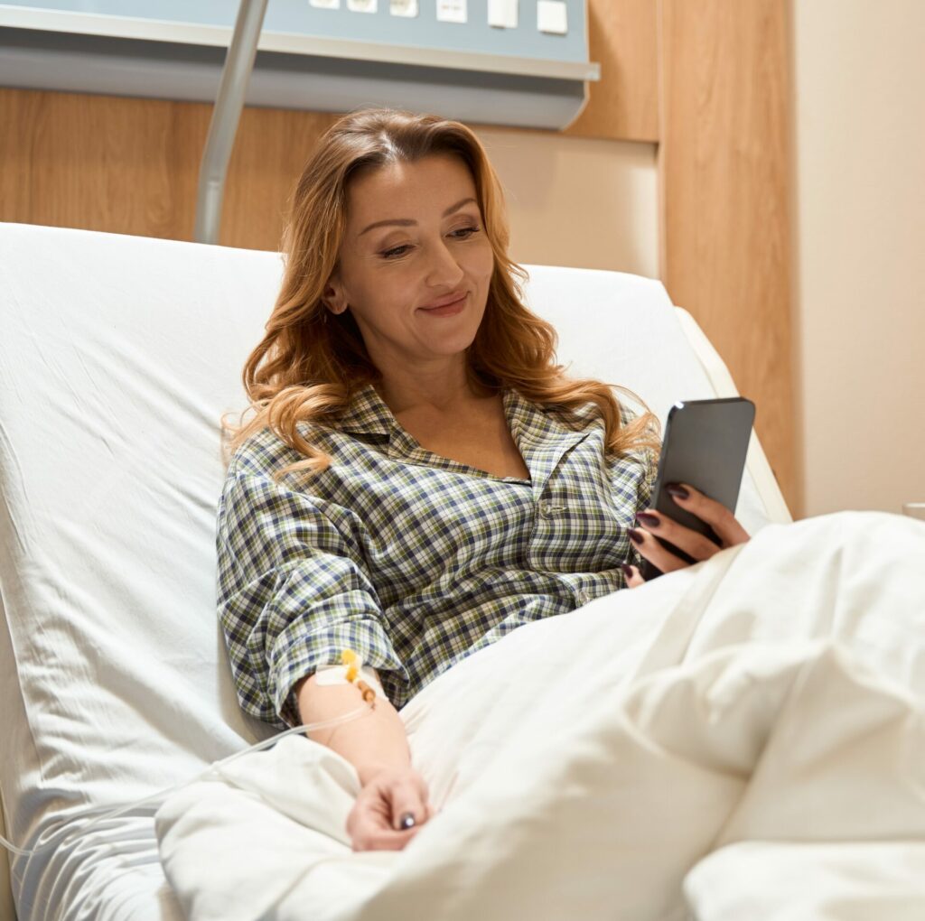 Beautiful woman sitting on bed in ward, looking at phone during drip treatment in hospital